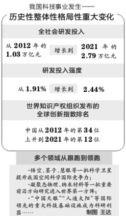 我国全社会研发投入从2012年的1.03万亿元增长到2021年的2.79万亿元,研发投入强度从1.91%增长到2.44%;世界知识产权组织发布的全球创新指数排名,中国从2012年的第34位上升到2021年的第12位……