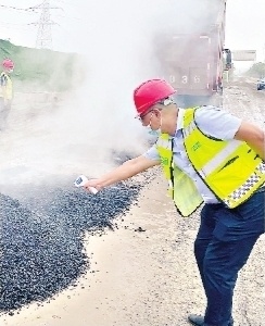 柳军为刚刚倾倒出的沥青测温。