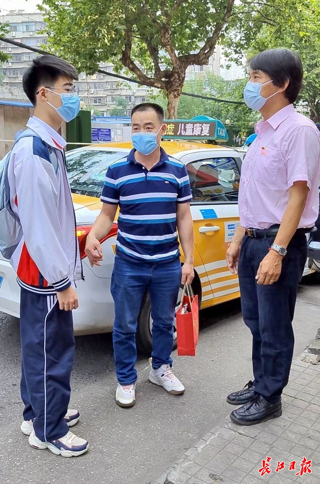 7时15分,小李和父母如约而至。小李的妈妈庄美凤是一位重残女士,在刘国庆的帮助下上了车。“华昌的的哥、的姐曾经风雨无阻免费接送我上了三年电大,今天又为我的孩子爱心送考,真的很感谢他们。”