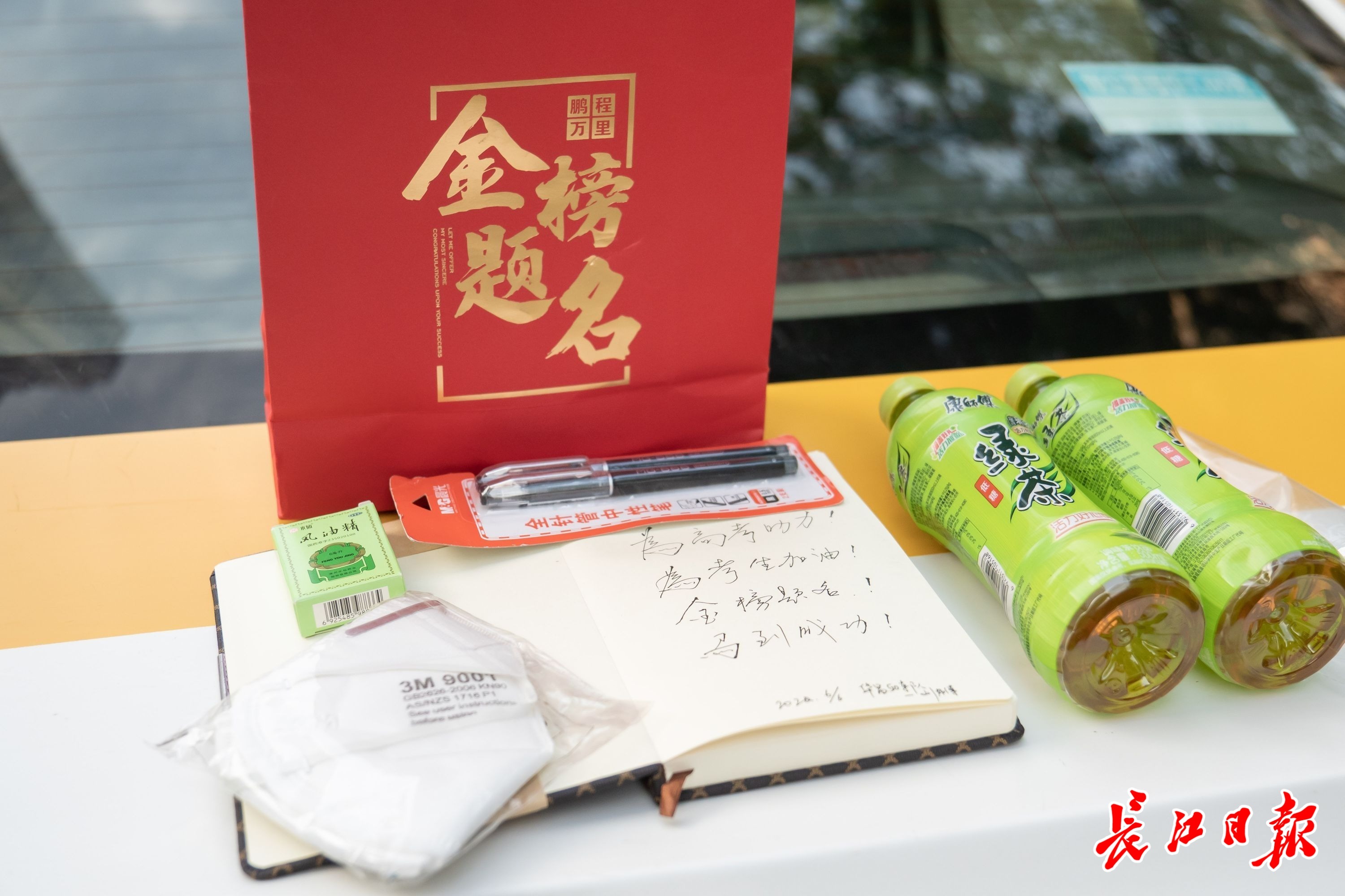 20年来,华昌公司组织的“爱心送考”活动,刘国庆一年不落。每年,他都会为考生准备“爱心加油包”。在今年的加油包里,他准备了绿茶、风油精、中性笔、口罩。崭新的笔记本的首页还留下了他的手写祝福:金榜题名、马到成功。