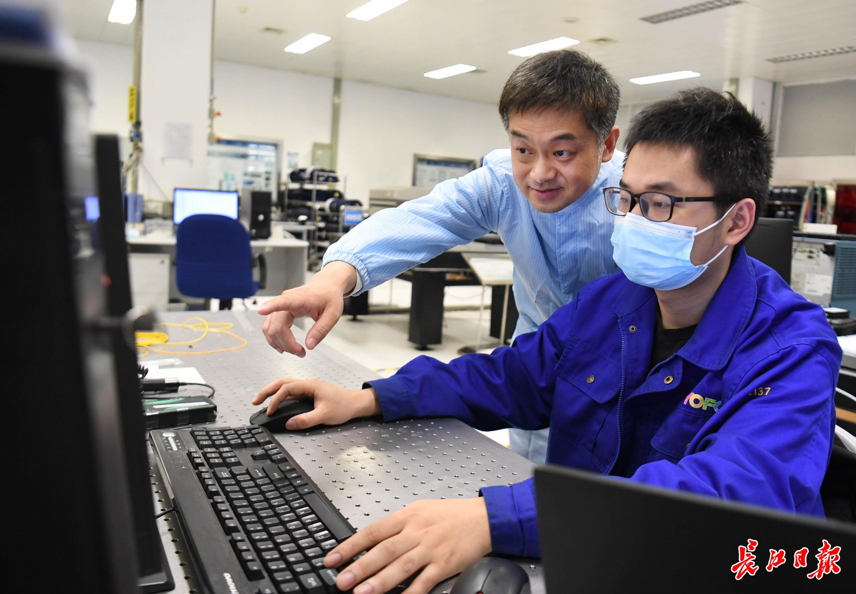 5月30日,长飞光纤光缆股份有限公司光缆首席科学家熊壮在光纤测试中心实验室指导技术团队人员。 长江日报记者高勇 摄