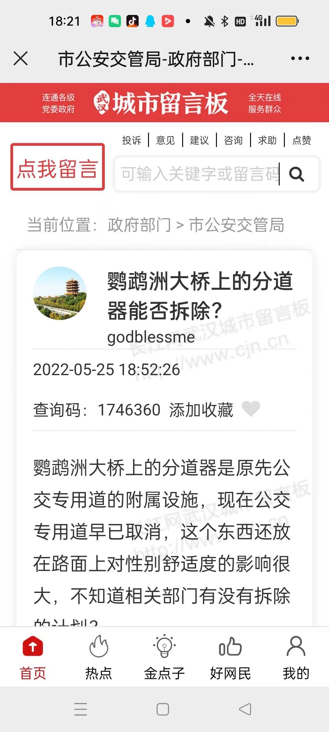 接到市民留言后,市公安交管局立即进行调查处置。市公安交管局回复表示,因拆除工作涉及多部门协作,协调沟通难度大,经多方努力最终得以实施拆除工作。5月28日至5月30日连续3天,市公安交管局设施工程大队组织协调辖区大队、施工单位、城运公司等单位,共出动施工车辆12台次,施工人员45人次,共计拆除反光分道器950个,目前,鹦鹉洲长江大桥上的分道器已经全部拆除完毕。