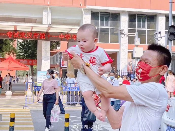 上午8时许,在武汉市第十一中学考点,一位爸爸抱着二宝给姐姐送考,小宝贝穿着“清华”字样的T恤软萌可爱。(湖北日报记者刘申、实习生王若颖)
