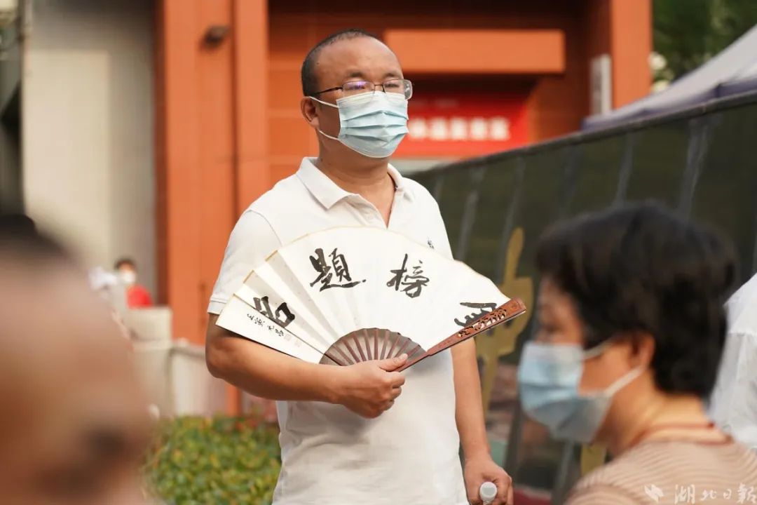 武汉市武汉中学考点,一位家长拿着“金榜题名”的折扇。(湖北日报全媒记者 魏铼 摄)