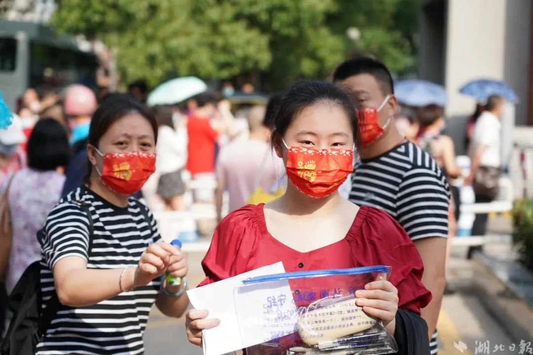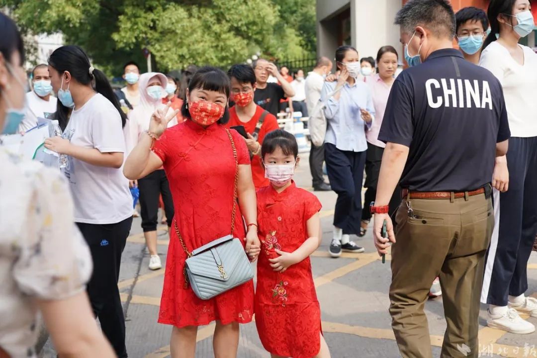 在武汉市武汉中学考点前,秩序井然,许多送考家长们和老师穿上预示祝福的红色T恤衫和各色旗袍,为考生们加油。(湖北日报全媒记者 魏铼 摄)