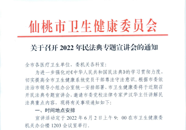 为深入开展“美好生活·民法典相伴”主题法治宣传活动,在全市卫生健康系统积极营造法治工作氛围,市卫生健康委组织开展了2022年民法典专题宣讲会。