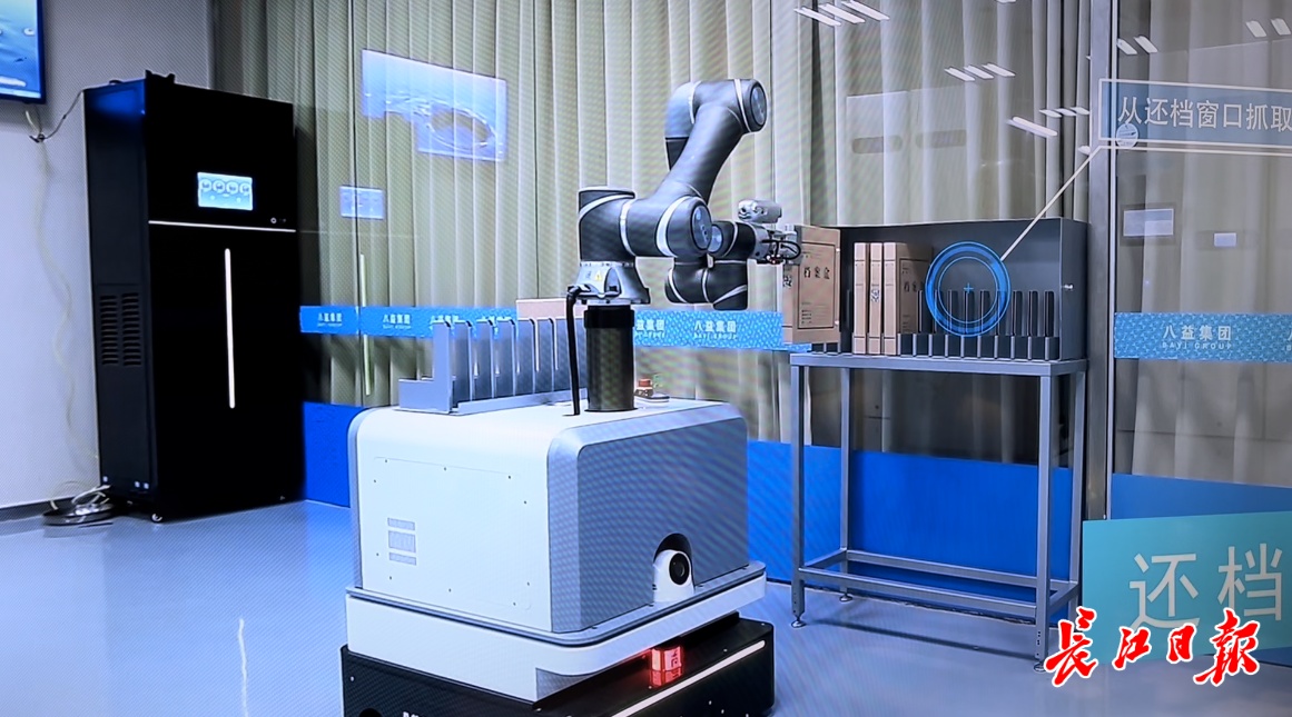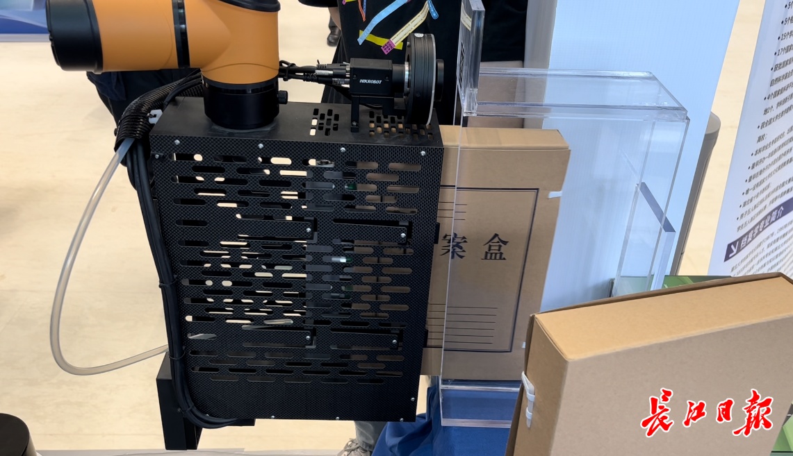 记者在交流活动现场看到,上海一家科技公司将存取档案机器人搬到摊位,发出指令,机器人扬起手臂,伸到档案夹前抓取其中一个档案盒,然后将档案送到另外一处档案夹,推送到其中一个夹层,整个过程有条不紊且精准无误。