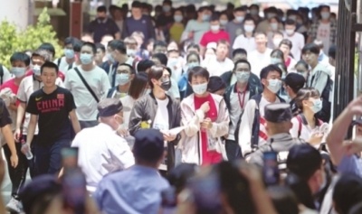 第一场语文考试结束,考生们冲出考场。记者胡冬冬 摄