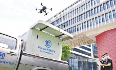武汉光电工业技术研究院光电创新园,武汉飞流智能技术有限公司技术人员在检测研发的超低空全自动智慧巡检系统。