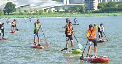在月湖公园举办的武汉全民健身运动会桨板比赛。