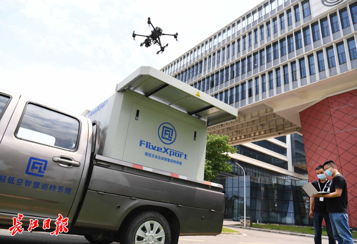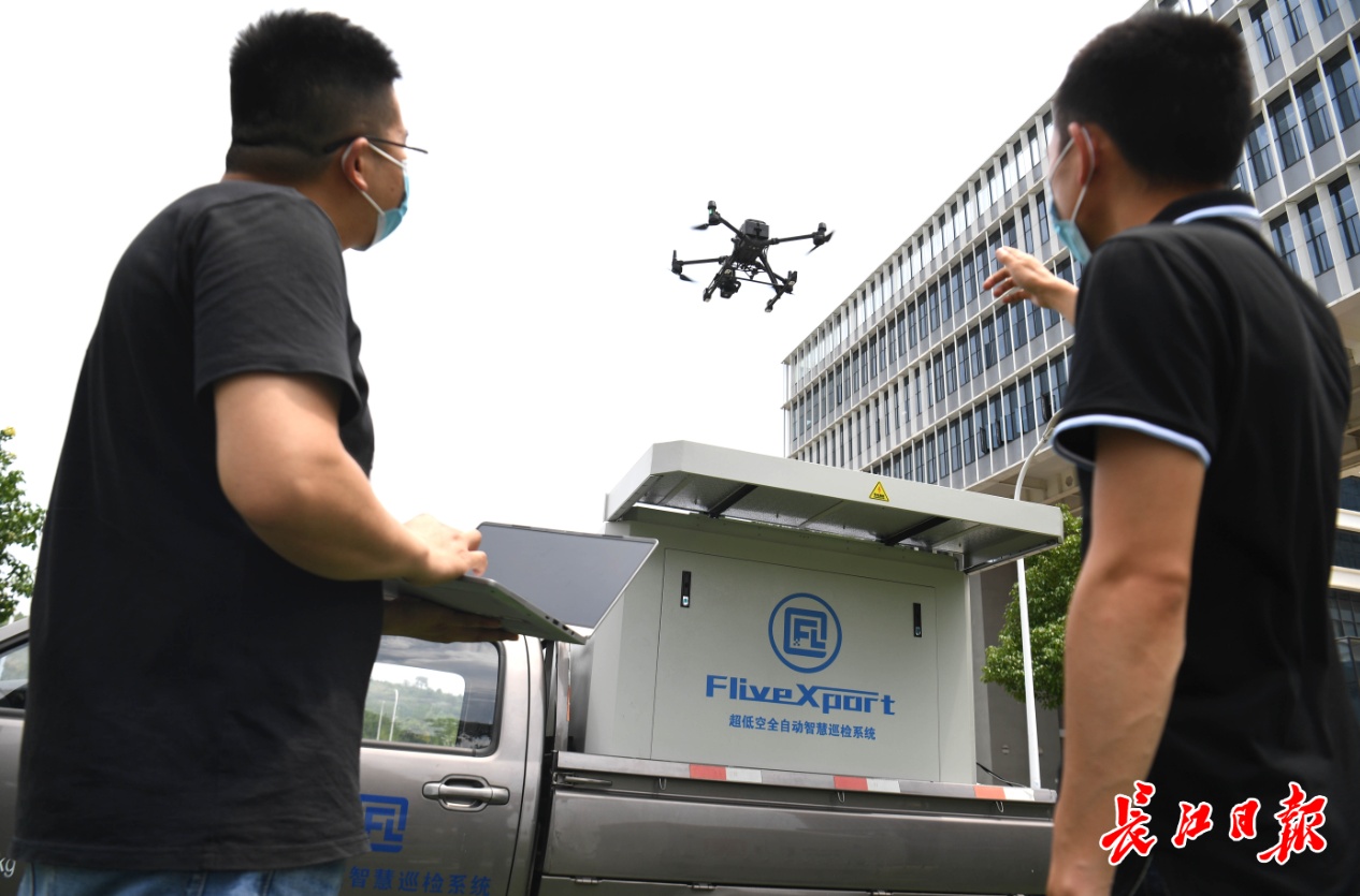 武汉光电工业技术研究院光电创新园,武汉飞流智能技术有限公司技术人员在检测研发的超低空全自动智慧巡检系统。记者高勇 摄