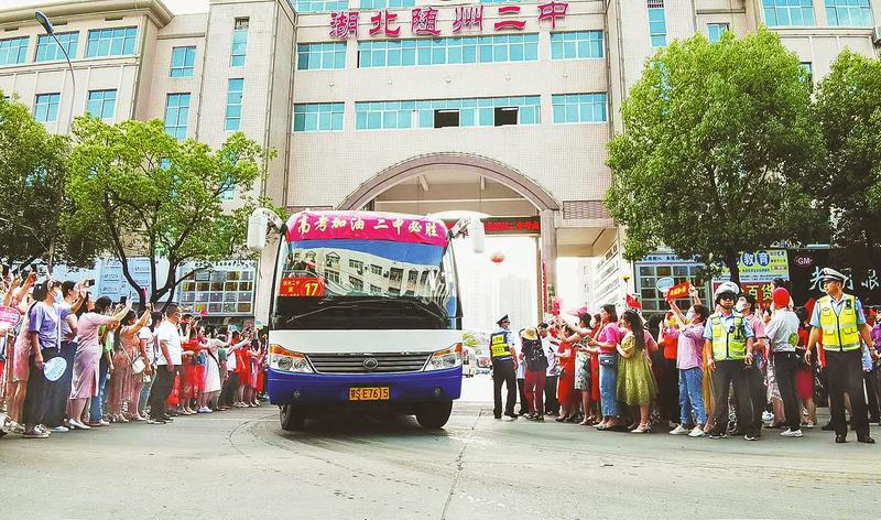 6月7日,高考拉开帷幕,我市1.6万余名考生分赴13个考点参加高考。图为学生家长正在随州二中大门前向奔赴考场的考生挥手加油。 (随州日报全媒记者李文军摄)