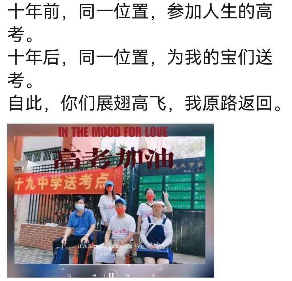 长江日报大武汉客户端6月8日讯(记者郭丽霞)“自此,你们展翅高飞,我原路返回。”6月8日早上,市四十九中考点门口,该校高三(6)班班主任、语文老师张靓正在给学生送考。十年前,她在同一考点参加了高考,十年后作为送考老师为班上的孩子们服务。