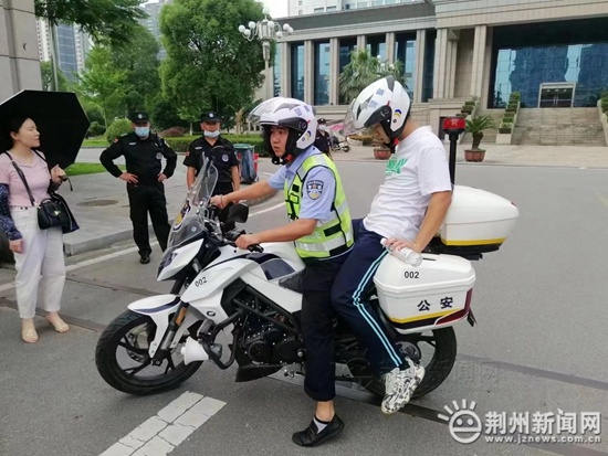 情况紧急,民警了解情况后,为了不耽误考生考试,中队长宋晖立即安排铁骑陶进驾车载考生,并为考生戴好安全头盔,做好安全防护措施。骑警一路开启双闪,走绿色通道,终于在8点10分带着考生顺利返回考点。