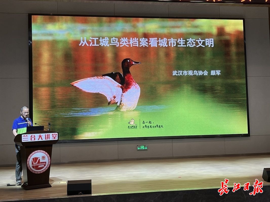 当日下午,武汉市观鸟协会会长、全国“志愿者护飞行动”先进个人颜军受邀在武汉市档案馆“兰台大讲堂”开讲《从江城鸟类档案看城市生态文明》。颜军着眼武汉市湿地鸟类的变化,讲解了鸟类基本知识、鸟类和我们共享城市空间、武汉市的鸟类多样性监测、从鸟类的变化看城市生态文明,生动展现了武汉城市生态文明建设的成就。