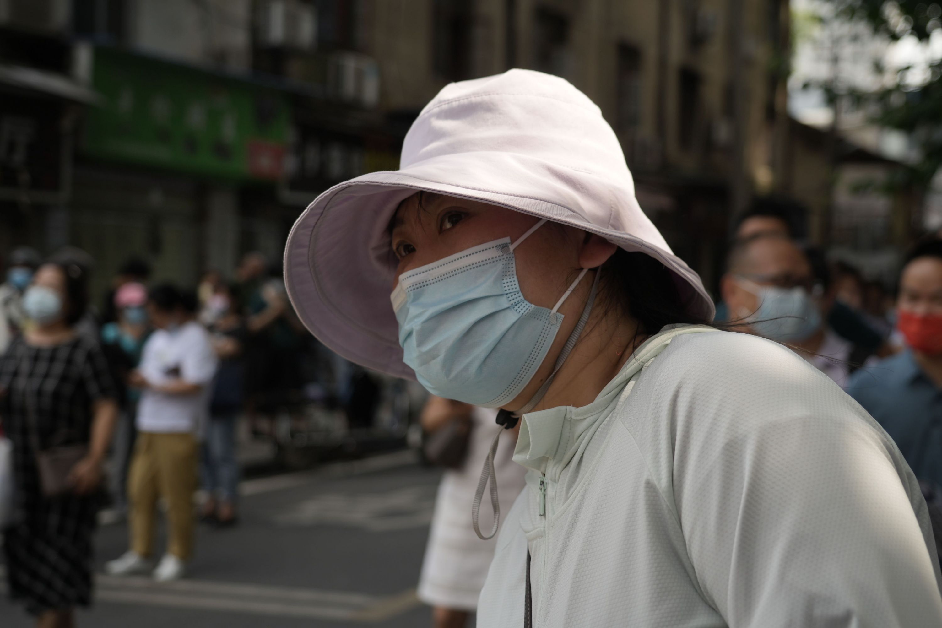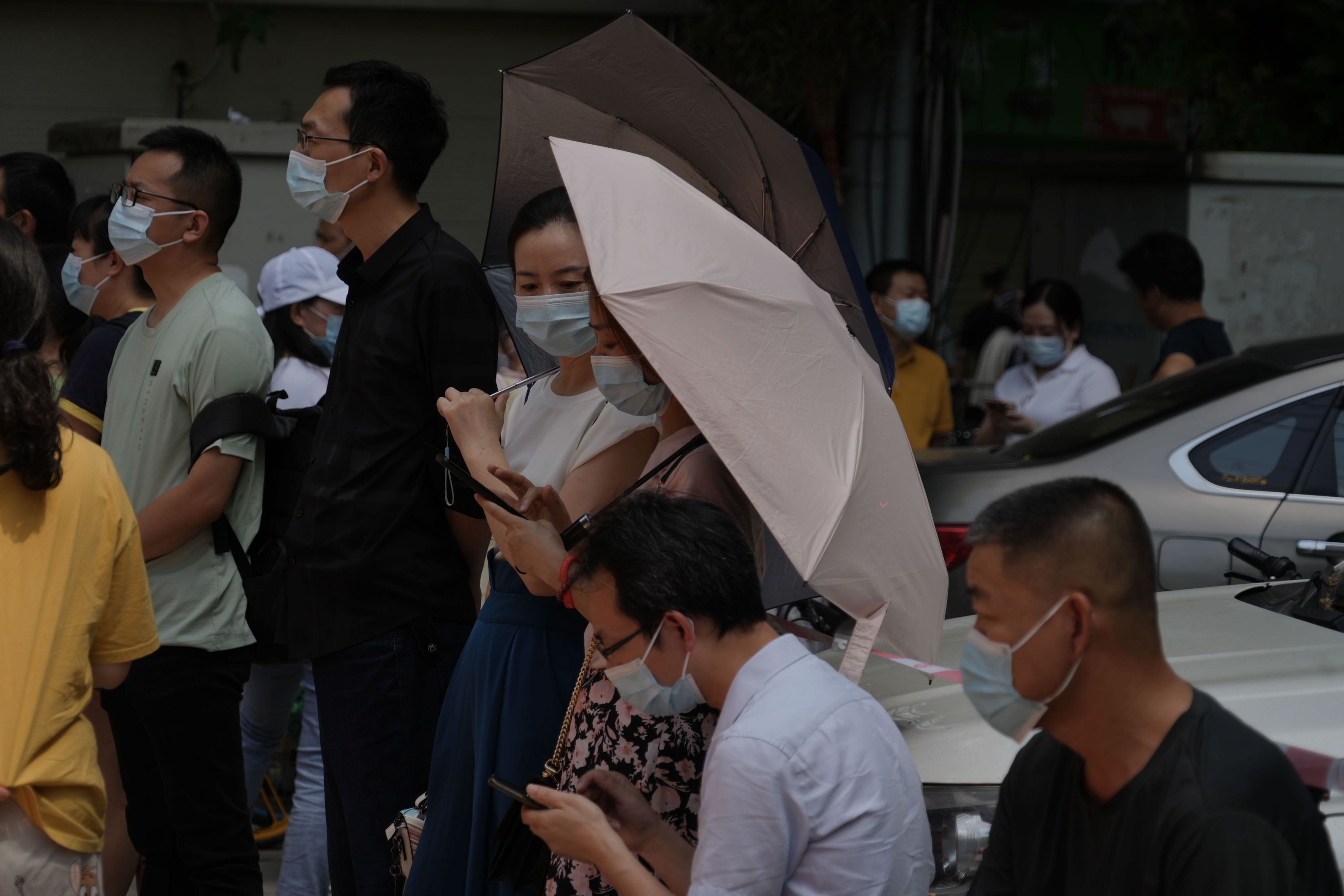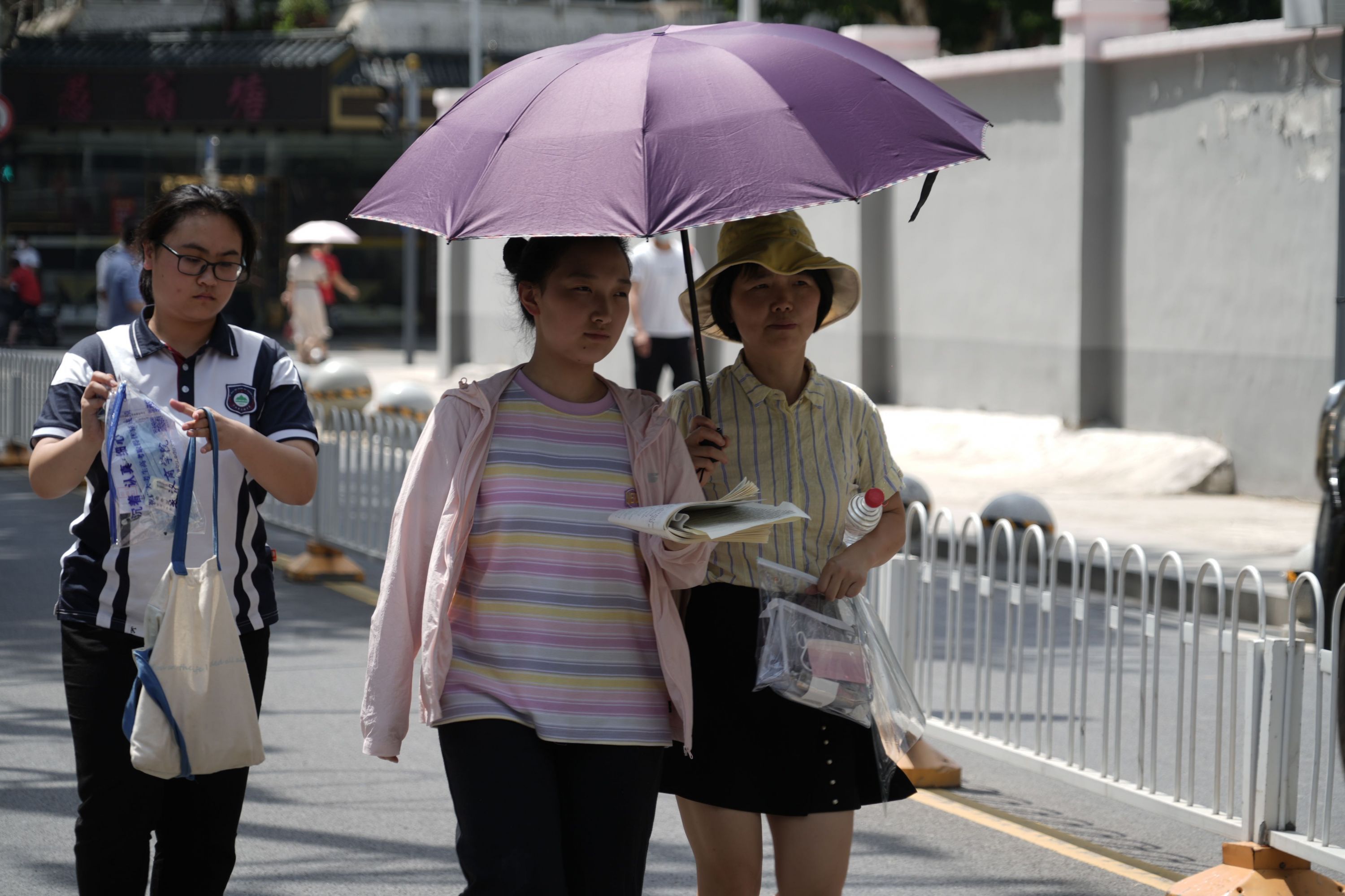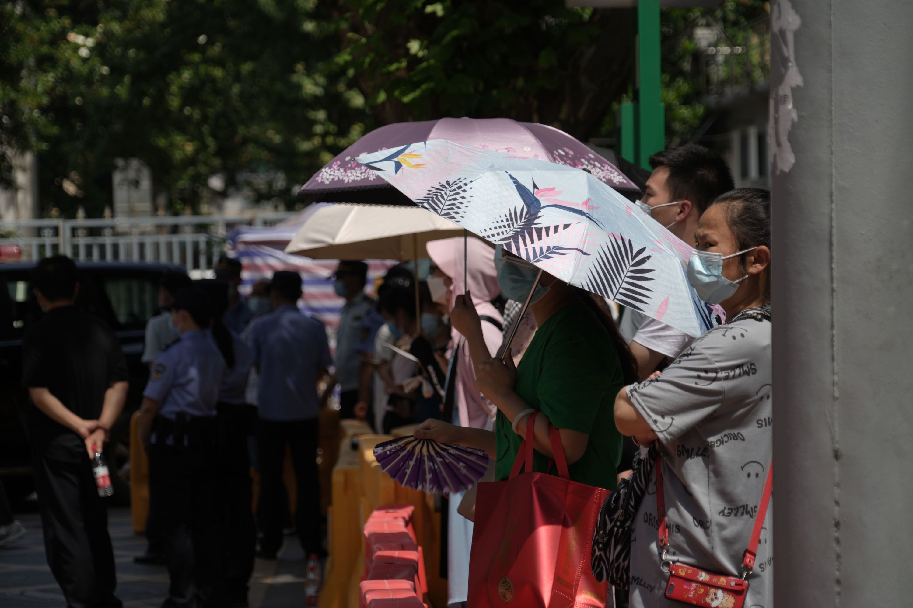 6月8日,高考第二天,下午气温升至34℃,湖北省武昌实验中学考点外考生和家长撑伞防晒。