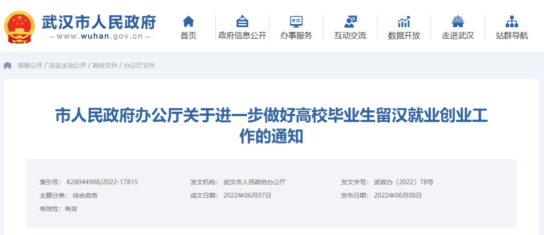 《通知》中提出武汉推行先落户后就业政策。高校毕业生凭毕业证书在市内落户,其配偶以及未成年子女可随迁落户。