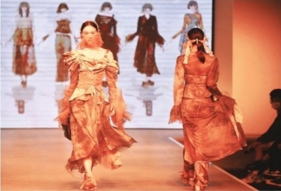 这90多套成衣,是武汉纺织大学服装学院两个“中日”班学生设计制作的。开幕式后,中日班11902班的学生带来主题为“丝·续”的开场首秀。