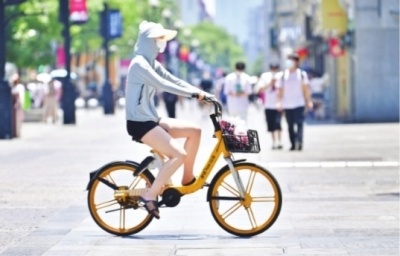 晴天持续,全副武装骑车的市民。记者喻志勇 摄