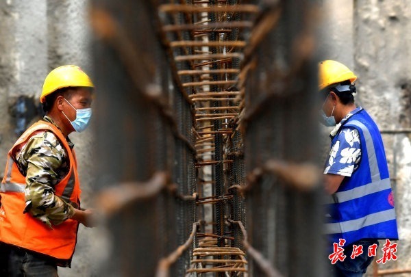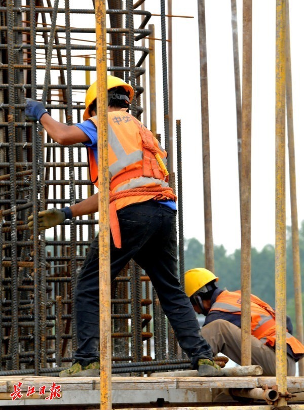 施工人员正在抓紧时间捆扎钢筋。 记者刘斌 摄