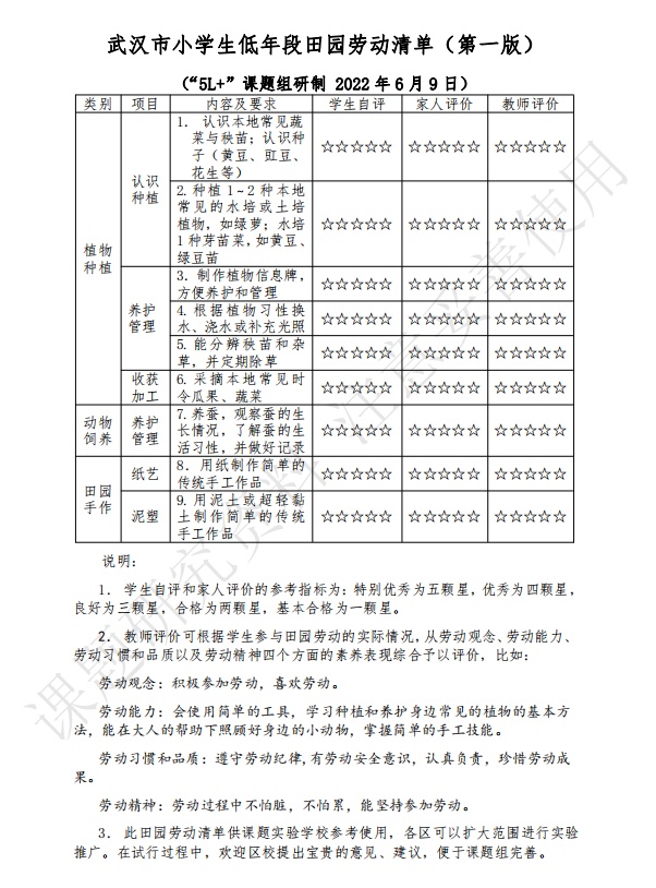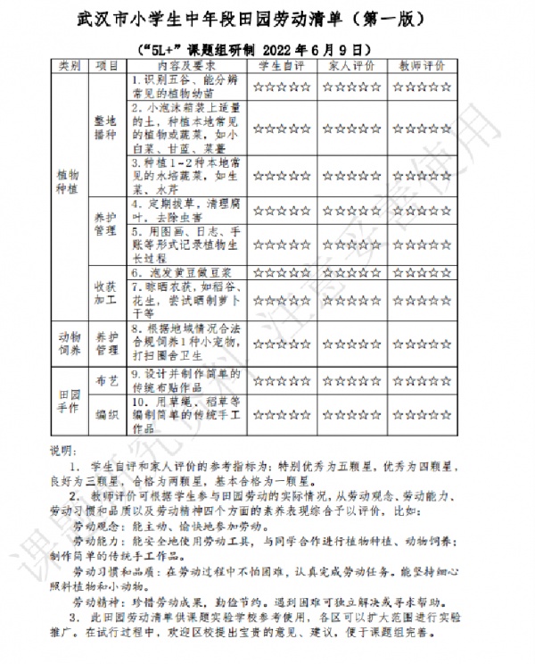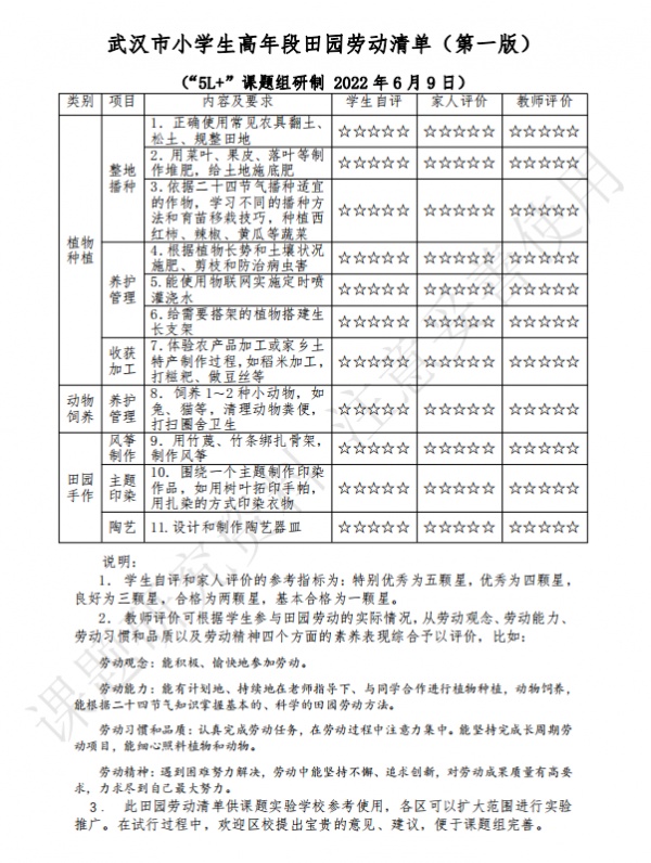 2021年底,由市教科院牵头的“新时代武汉市小学劳动教育‘5L+’课程开发和实践”课题组开题,其中“L”是劳动(labor)的英文单词首字母,“5L”指的是家园劳动、校园劳动、社园劳动、田园劳动、创园劳动这5个方面。针对田园劳动,武汉市教科院联合江汉区大兴第一实验小学等14所学校共同开展研究和实践。各校的实践、研究经验共同形成了《武汉市小学生田园劳动清单(第一版)》。