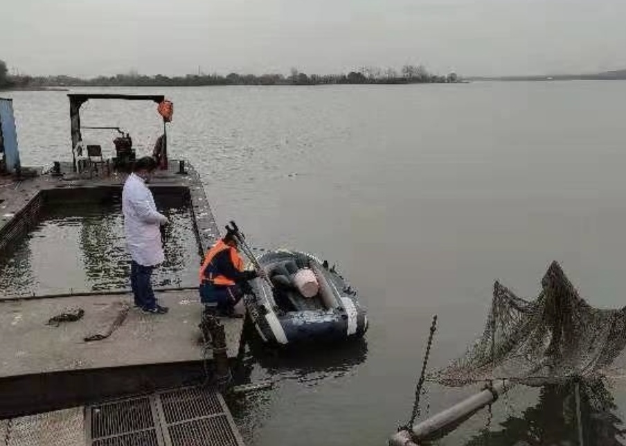 生态环境监测人员在检测严西湖水质。通讯员涂慧琴 供图