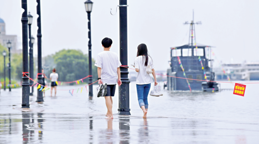 汉口江滩临水岸边,工作人员已拉起警戒线,提醒亲水游玩的市民注意安全。