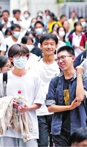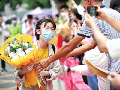 6月9日18时15分,高考最后一门考试结束的铃声响起,考生轻松走出湖北省武昌实验中学考点(上图),家长给考生送花(下图)。