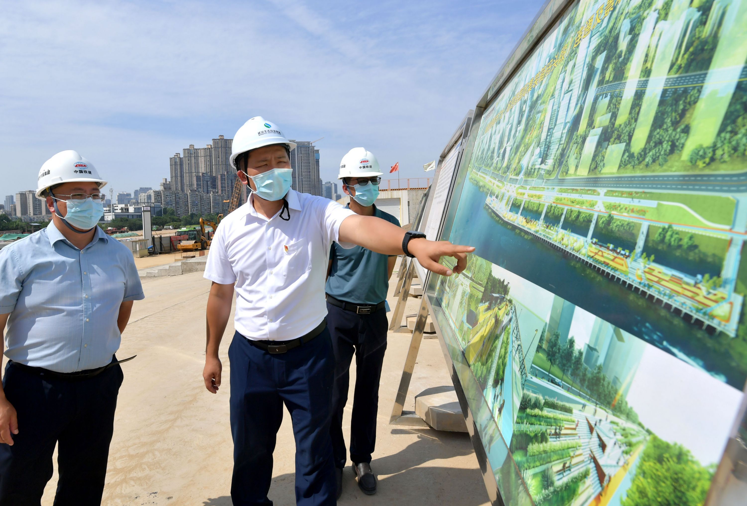 车涛(左)在杨泗港都市T台项目现场了解工程进展情况。记者刘斌 摄