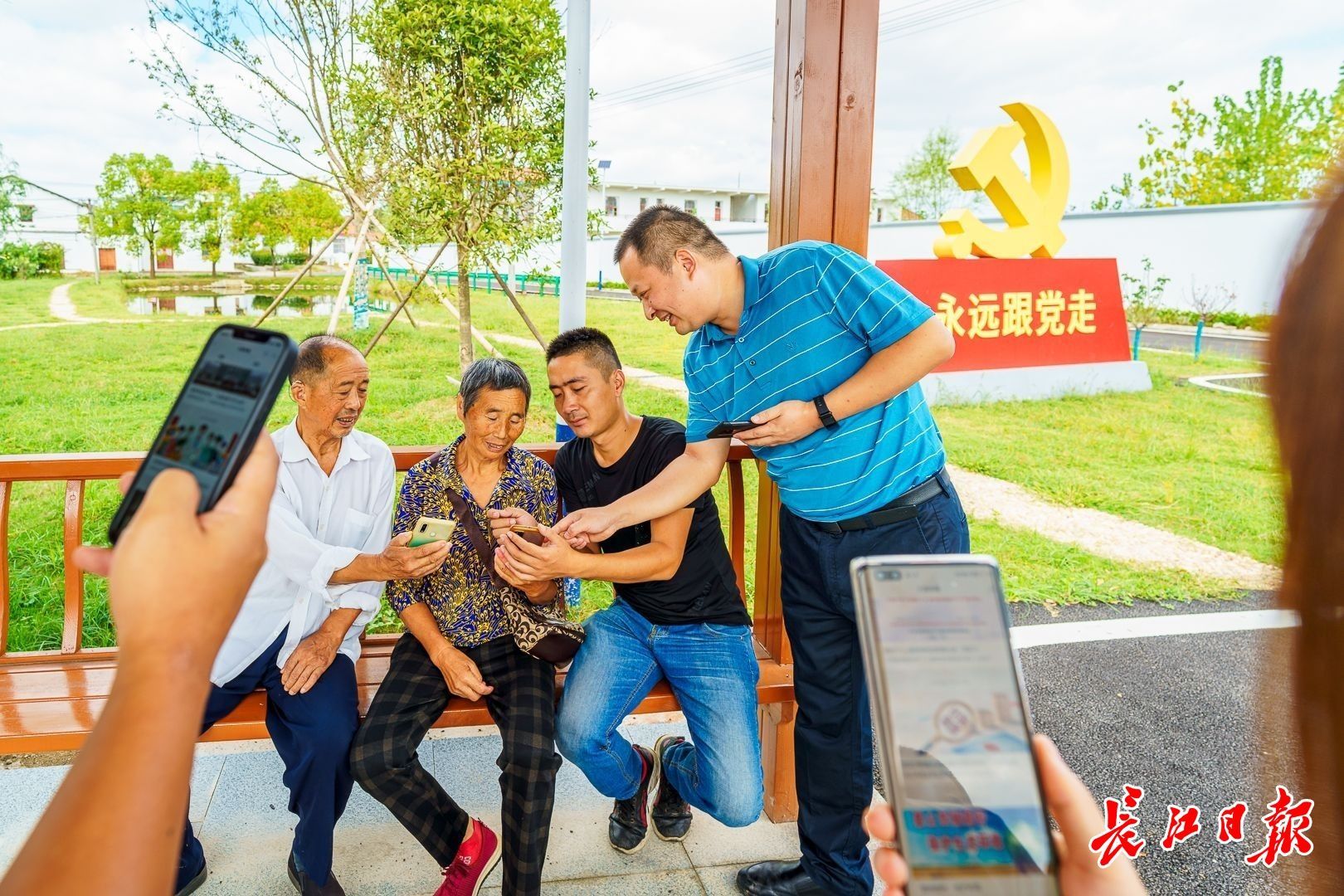 朱俊刚(右一)手把手教村民在“大美朱铺”微信公众号了解村务信息,为朱铺村发展建言献策。长江日报记者刘帅 摄