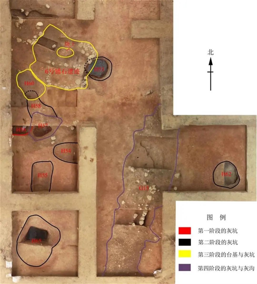 盘龙城遗址杨家湾北坡揭示出的铺石遗迹及周边灰坑布局。