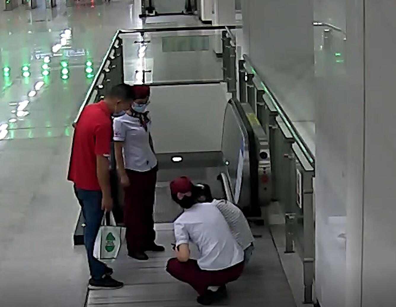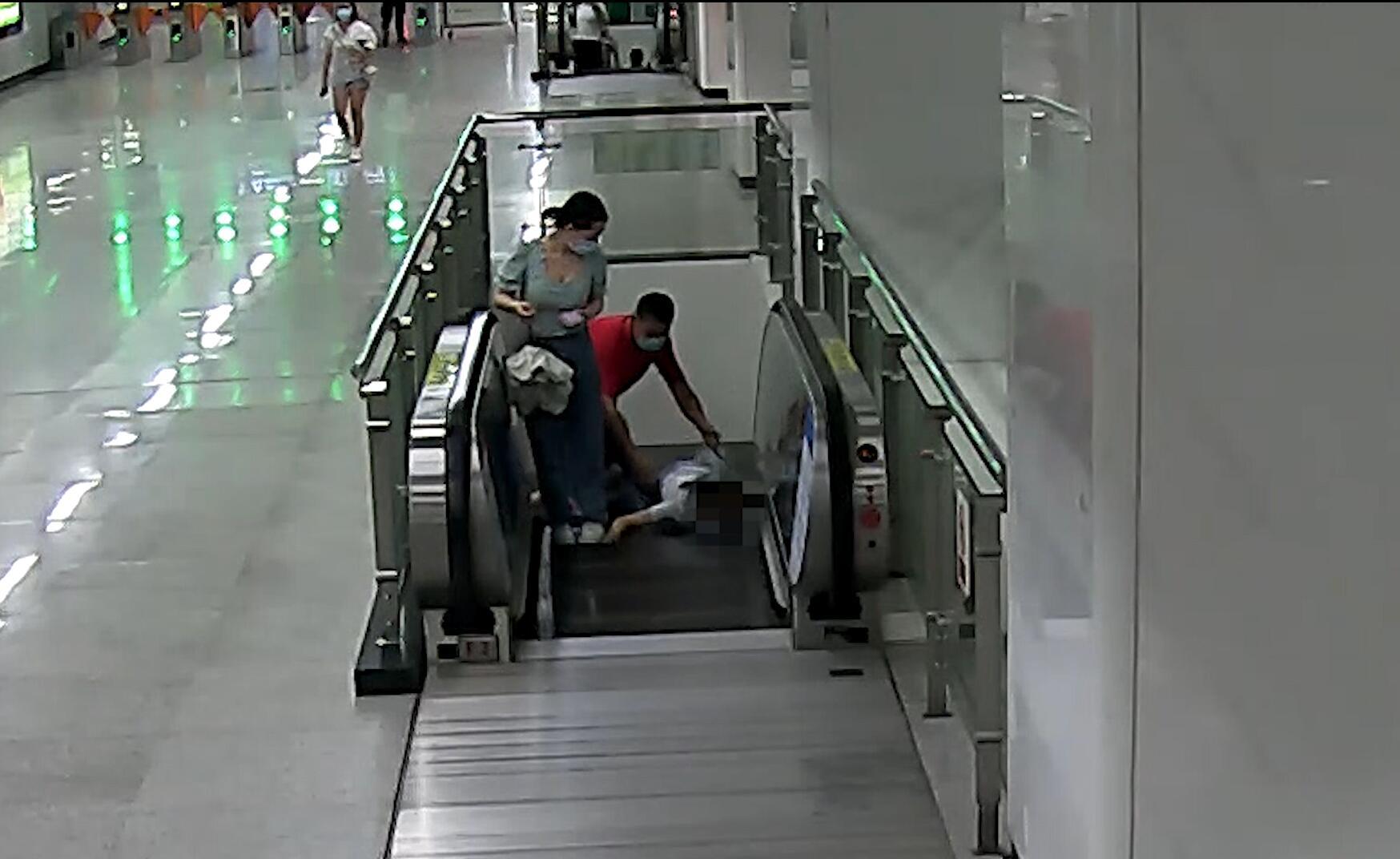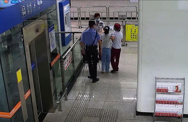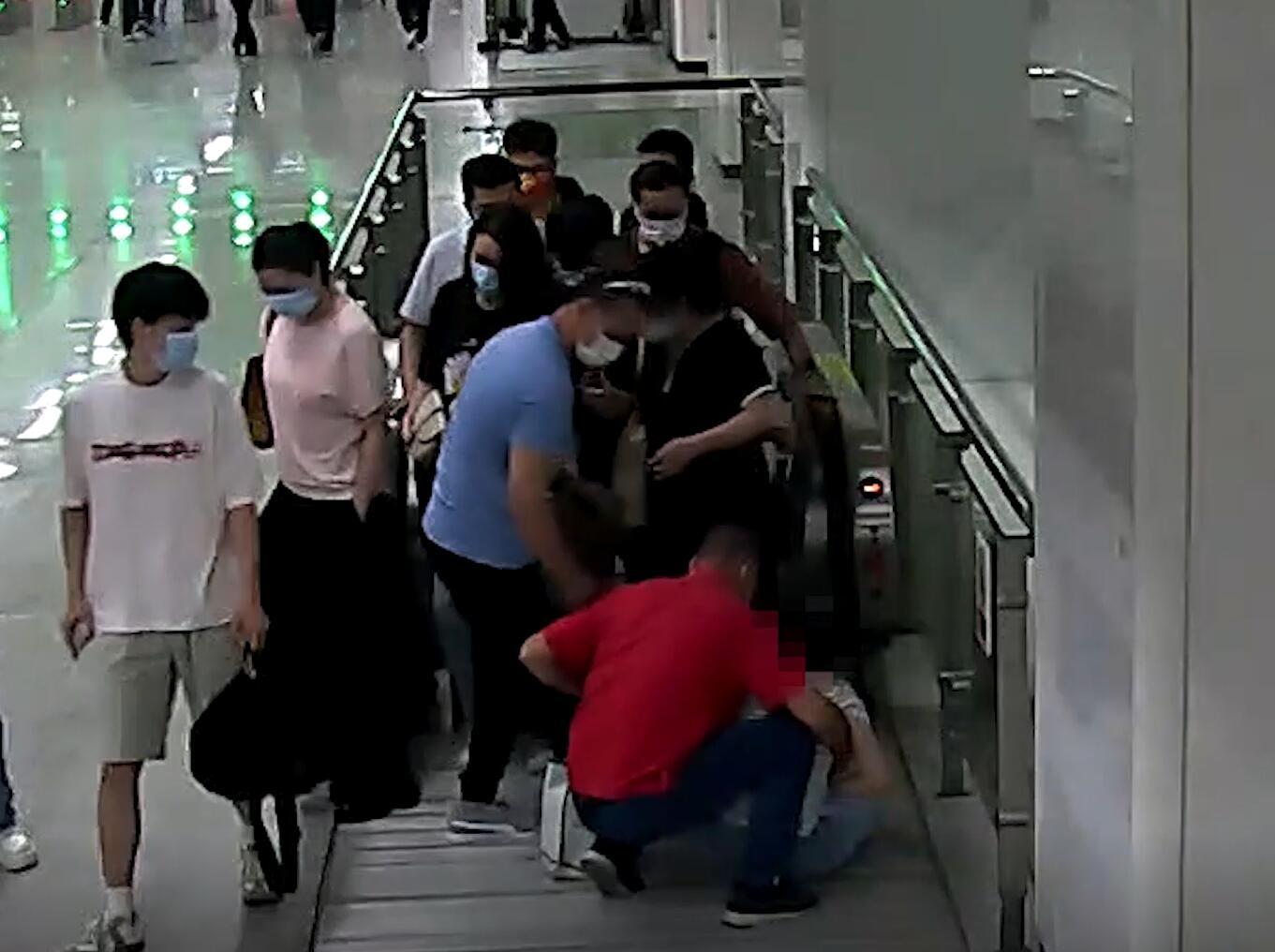 正在站厅巡视的地铁工作人员曾美智听到乘客求助后,立即跑到现场。“您是乘客的家属吗?”“不,我不是,刚刚在电梯上我站在她身后,她突然倒下去了,我就马上把她抱起来了。”红衣乘客回答。