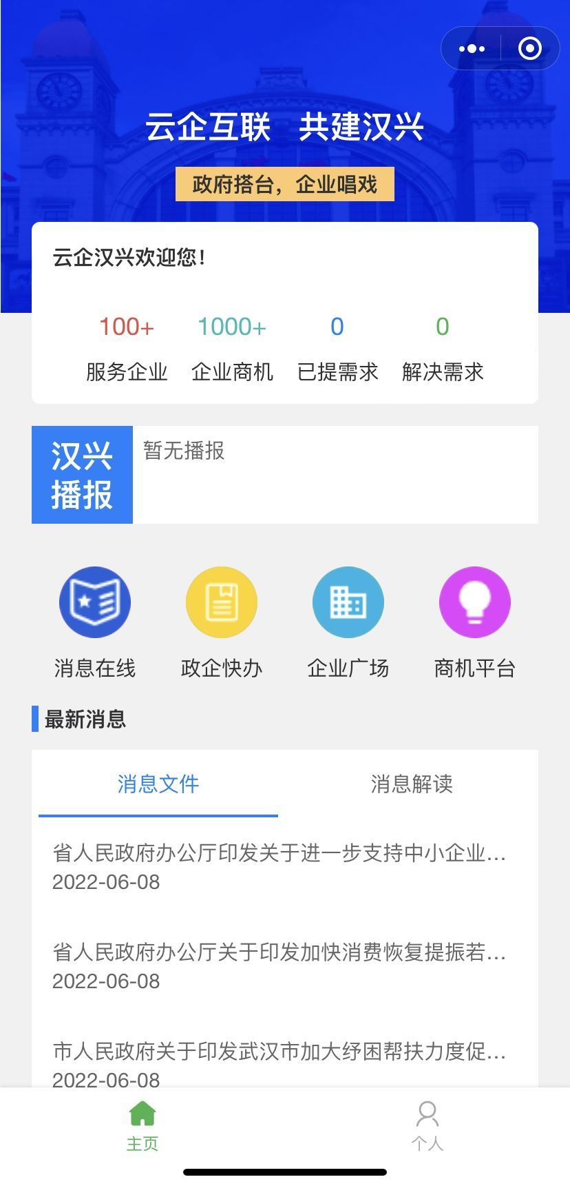 长江日报记者扫码进入“云企汉兴”微信小程序,看到页面设计得简洁清新,首页有“汉兴播报”“消息在线”“政企快办”“企业广场”“商机平台”以及“企业风采”等板块,分别对应企业所需的不同功能。