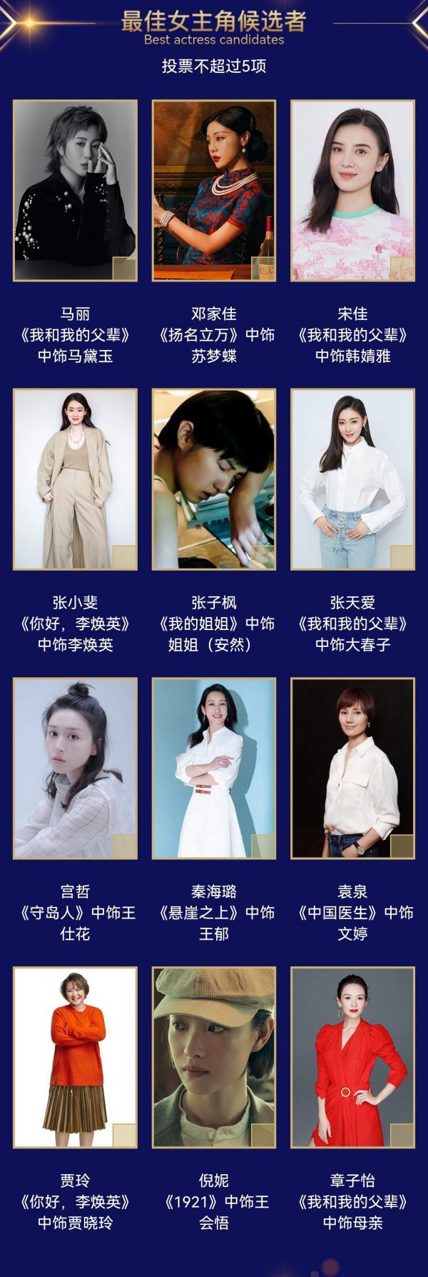 据统计,《我和我的父辈》凭借四位导演、四组演员的强大阵容,共占据了22个候选席位,其中最佳男主角、最佳女主角、最佳男配角、最佳新人等奖项中均有4人候选。