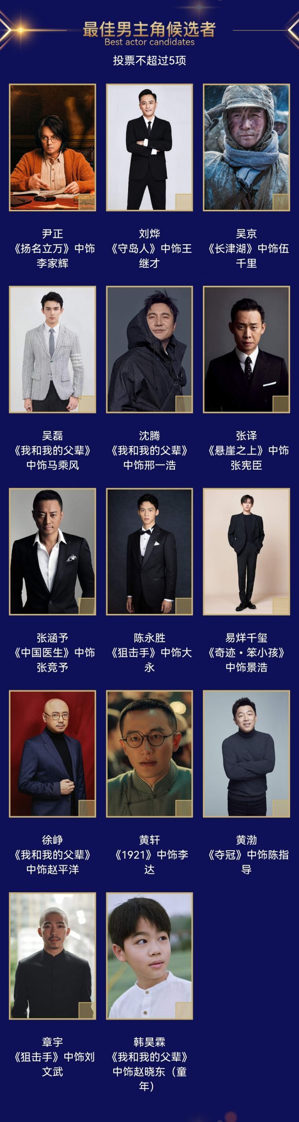 更令观众们惊讶的是,在最佳男主角的候选者中还有一张非常稚嫩的面庞,在《我和我的父辈》中饰演童年赵晓冬的韩昊霖,出生于2009年的他才不过13岁。许多观众不一定熟悉他的名字,但看到他的脸就会想起,这个小男孩正是《庆余年》中的小范闲,《人世间》中的小光明。在《我和我的祖国》《我和我的家乡》《我和我的父辈》系列中,他也全都有参演。