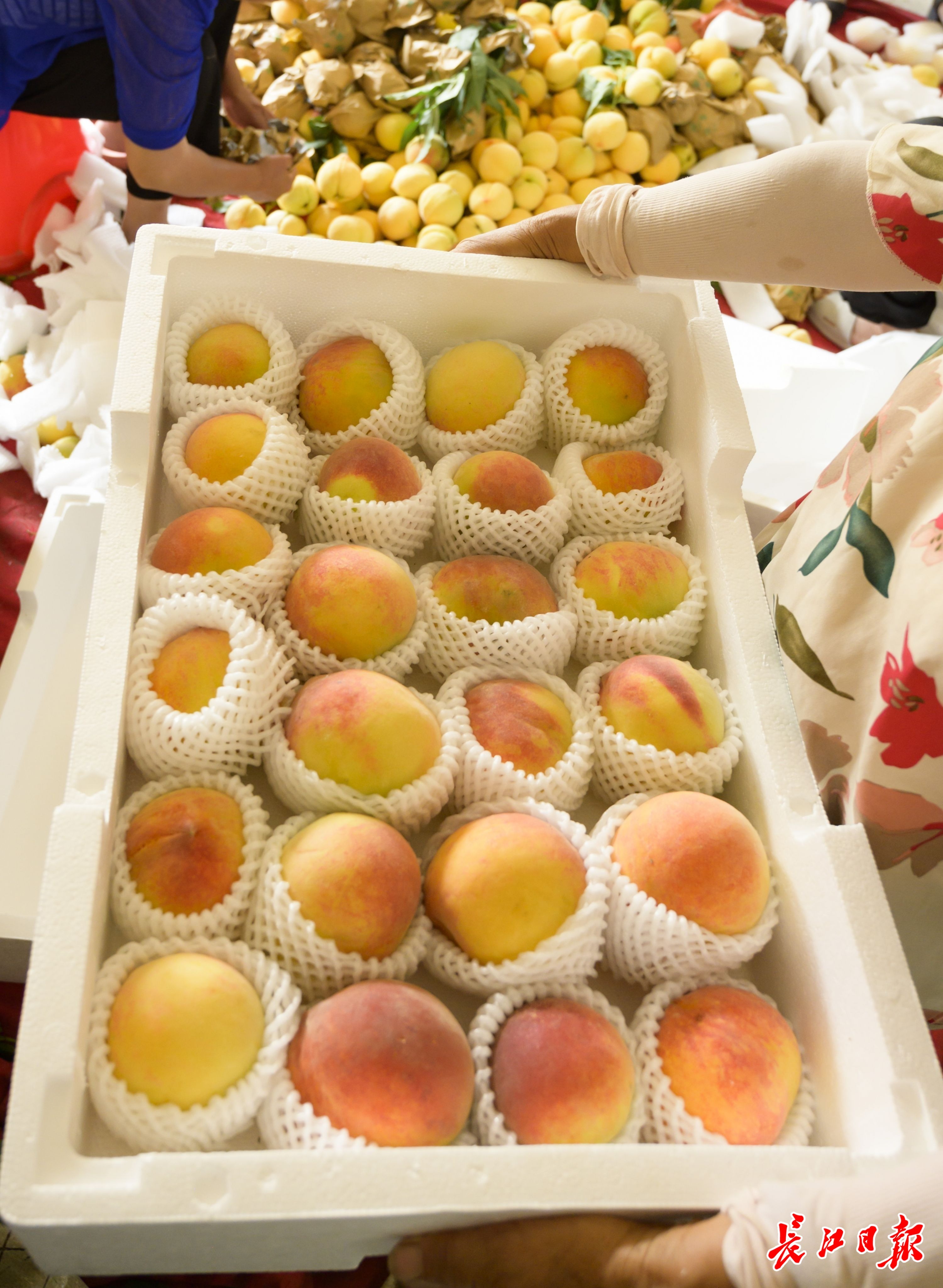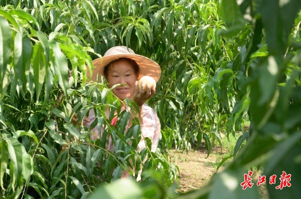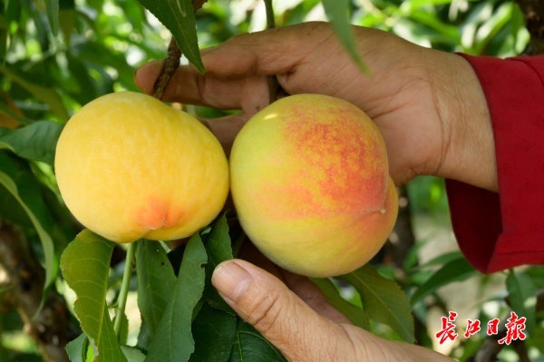 2022年6月10日,在东西湖区东山街卫东大队,村民廉满印承包的140亩黄桃上市,新鲜的黄桃果肉橙黄,令人垂涎,吸引大量客户前来购买订货。