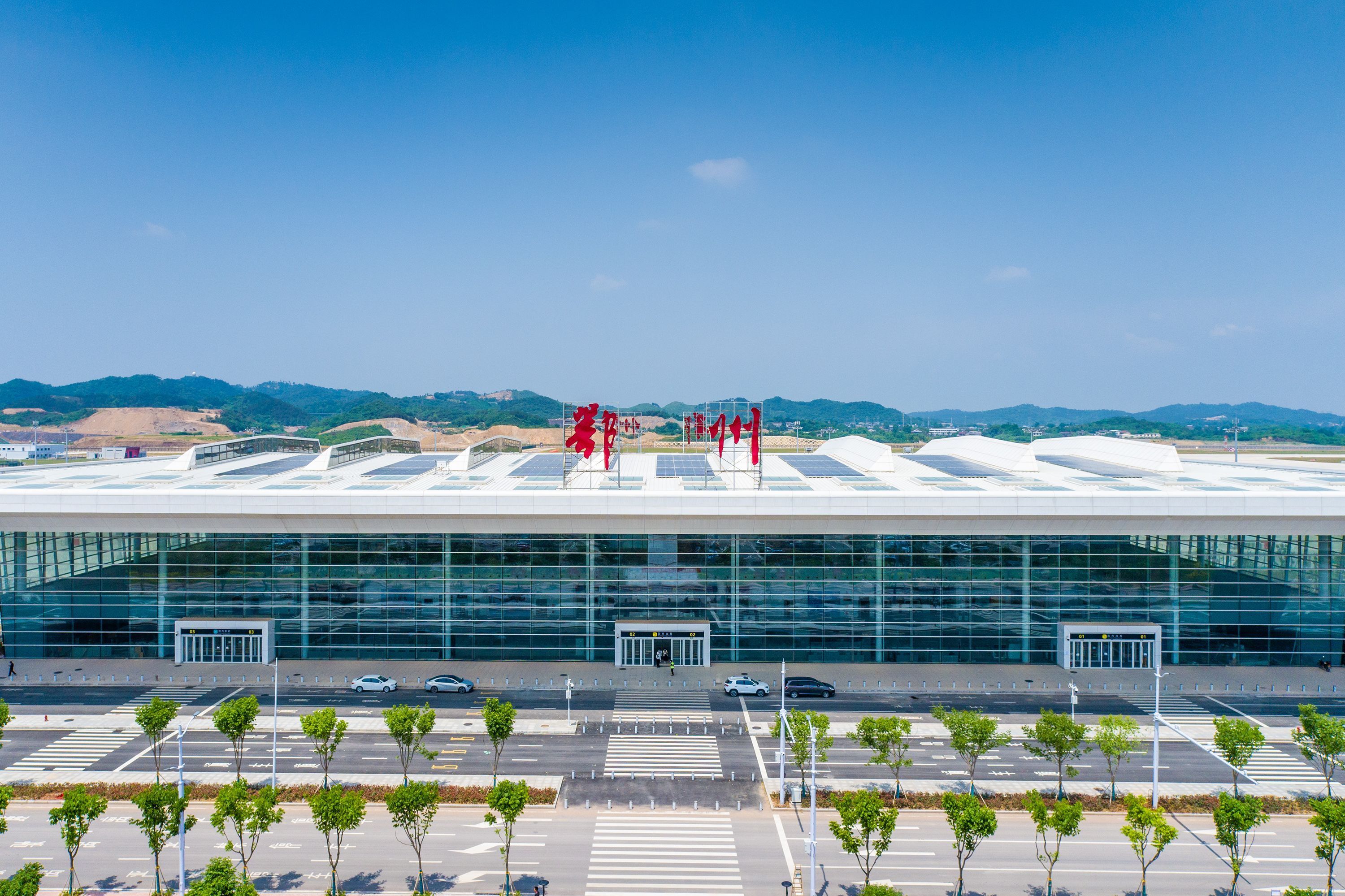 鄂州花湖机场航站楼在蓝天映衬下显得简洁大气。 记者任勇 通讯员何煦风 摄
