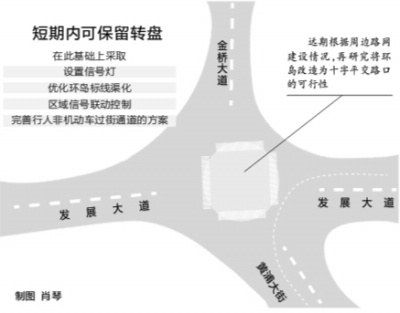 交管部门介绍,尽管在初期的市民调查中,大多数人选择拆除转盘,但在收集意见阶段,反对拆除转盘的市民提出了详细的理由和优化建议,还有相当一部分态度中立的市民表达了“拆除转盘应谨慎,保持长远眼光”的态度。专家论证也认为,短期内可保留转盘,在此基础上采取设置信号灯、优化环岛标线渠化、区域信号联动控制、完善行人非机动车过街通道的方案,远期根据周边路网建设情况,再研究将环岛改造为十字平交路口的可行性。