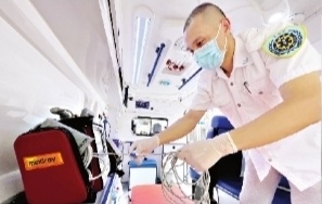 武汉市第五医院医疗急救队队员正在整理急救车内的设备。