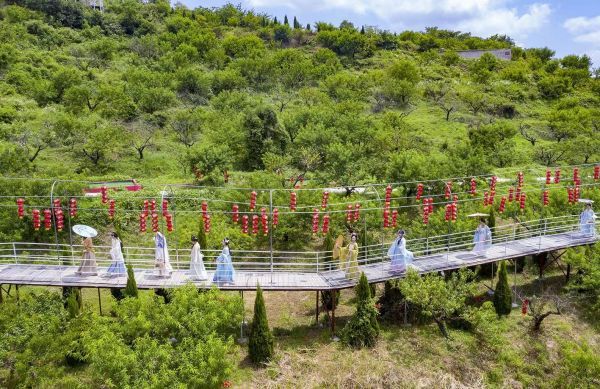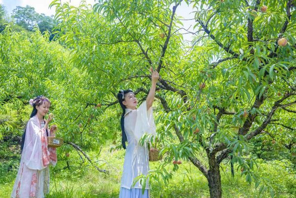 “哇,好多汉服小姐姐!”当日,在美丽的沼山乡村公园,十余位汉服少女手提果篮,裙带飘飘,从桃园的小道漫步而来,成为一道行走的风景线。