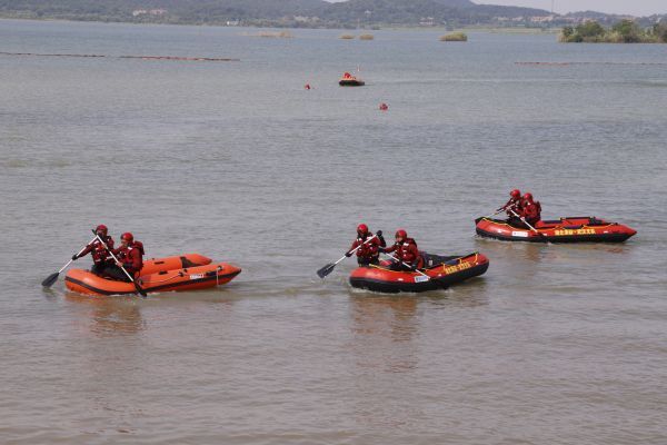 只见救援人员模拟出突遇激流的情形,橡皮艇不幸侧翻,四名救援人员纷纷落水。随后,两名救援人员率先爬回翻覆的艇上,安装固定绳索,四名人员一同利用绳索合力将翻覆的橡皮艇摆正,并帮助其余两名救援人员爬回艇上,整个过程仅用时五分钟。上午10时30分,八项演练科目全部顺利完成。