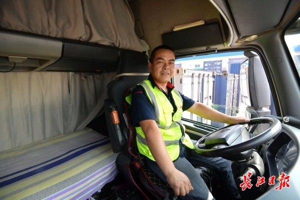 5时,他踩着两级梯子,快速爬上一人多高的驾驶室,坐下、扣上安全带,一手把着方向盘一手握住变速杆,踩下油门,15米长的半挂车出发。