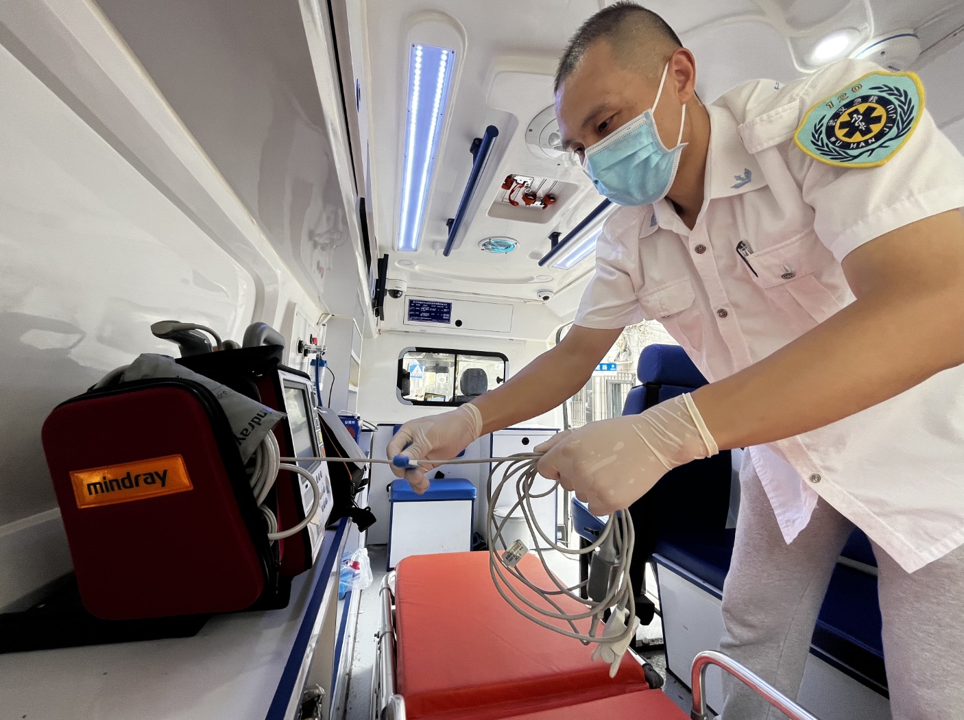 武汉市第五医院医疗急救队队员正在整理急救车内的设备。记者秦璟 摄