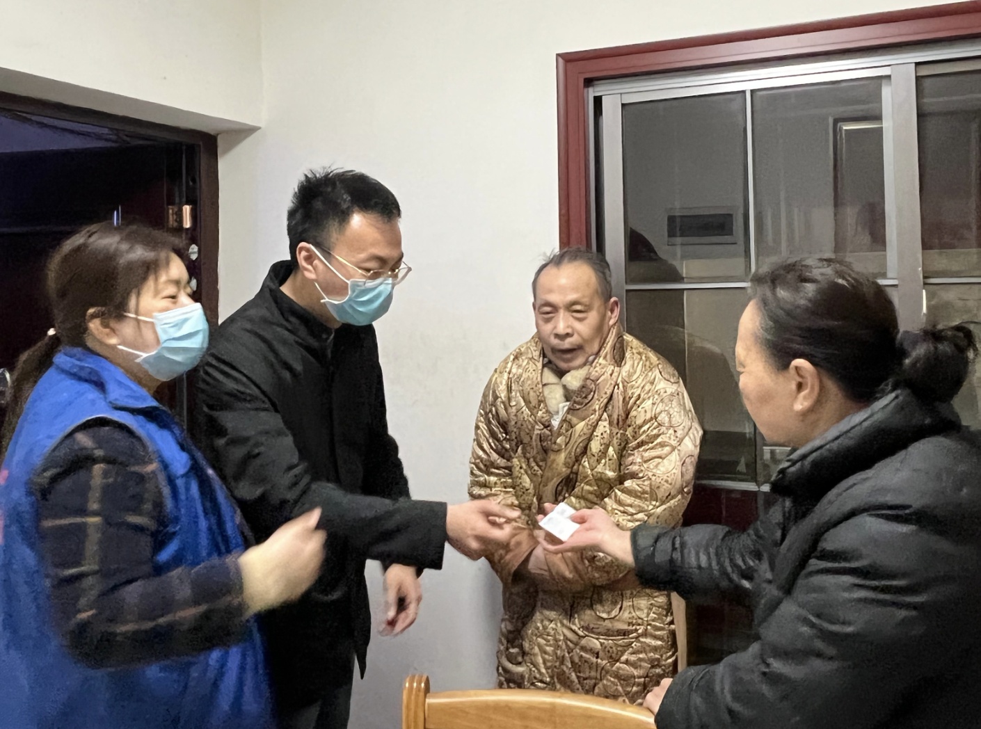 3月份项目启动时,魏龙艺(左二)与社区工作人员上门为老人送联系卡。魏龙艺供图
