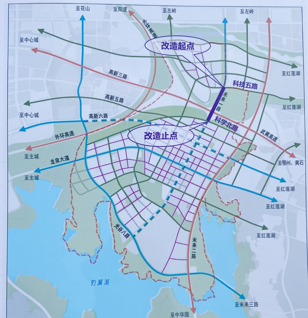 作为东湖高新区内一条南北向城市主干路,未来一路(科学北路—科技五路)是进出光谷科学岛的重要门户之一,项目建成后将大大加强科学岛对外联系的便捷性,增强对外中长距离交通能力,对打造光谷区域科创大格局意义重大。