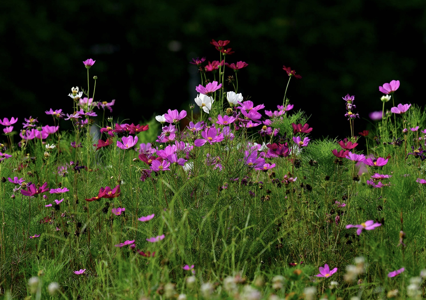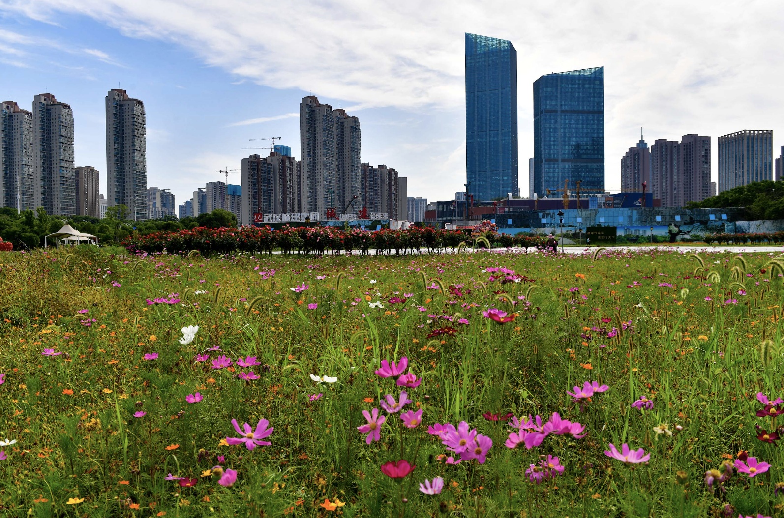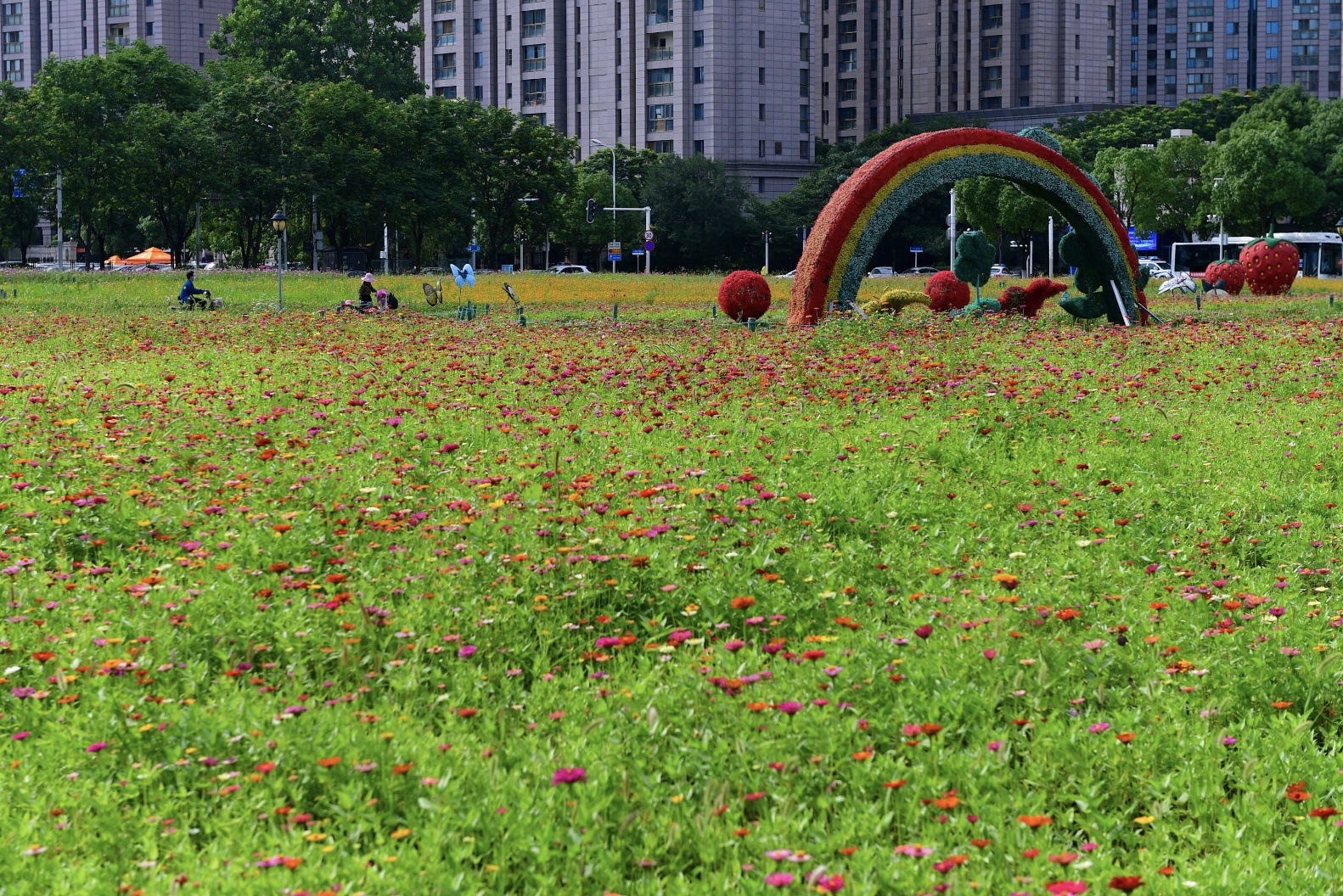 长江日报大武汉客户端6月11日讯 6月11日,武汉市江汉区泛海广场前,正值盛花期的硫华菊、波斯菊、百日菊开出了大片的夏季花海。金黄色的硫华菊、粉白色的波斯菊、五彩斑斓的百日菊与白车轴草、狗尾草等交织在一起,形成“草原花海”既视感。穿行其间,歌曲《火红的萨日朗》不自觉的在耳畔萦绕。点缀在花海中的“南瓜”、“草莓”、风车、木屋,以及环绕四周的摩天大楼,更让这片“草原花海”如一处闹市中的“世外桃源”。