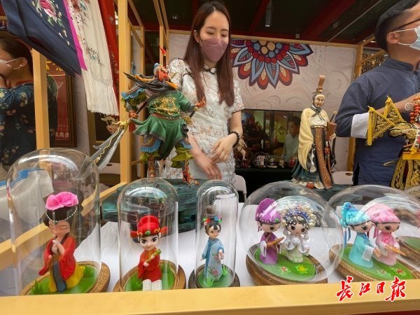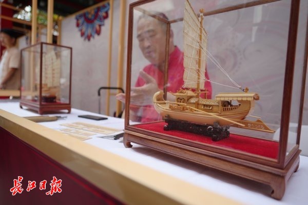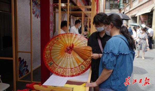 在吉庆街主会场,近百个非遗项目通过展演、传承人展示、图文展板、网络直播,线上线下齐发力,全力阐释非遗“连接现代生活 绽放迷人光彩”的主题。记者看到,“非遗创造美好生活”传统手工艺精品展汇聚汉绣、面塑、苏恒泰油纸伞、汉锣、玉雕、剪纸、木雕船模等20个极具武汉特色的非遗项目,传承人带来的“指尖上的绝活”,吸引了市民现场加入“非遗”大军。