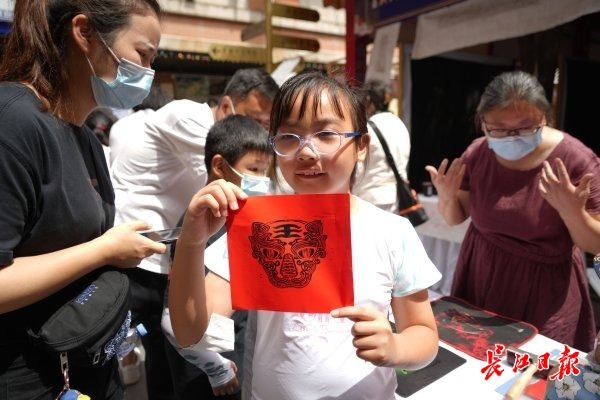 7岁的张睿恒小朋友,一大早便在父母的陪同下,来吉庆街逛展,他很快就被木刻版画制作吸引,在师傅手把手的指导下,现场木刻了一幅“虎王”。他告诉记者,这个“虎王”很像三星堆遗址里的图案,很漂亮,“我的力气很大,适合做木刻,以后还想报名学习”。与张睿恒一样收获颇丰的还有他的父母,“我们在非遗市集上买了一些小玩艺,非遗是中国传统文化,希望一代代可以继续传承下去。”
