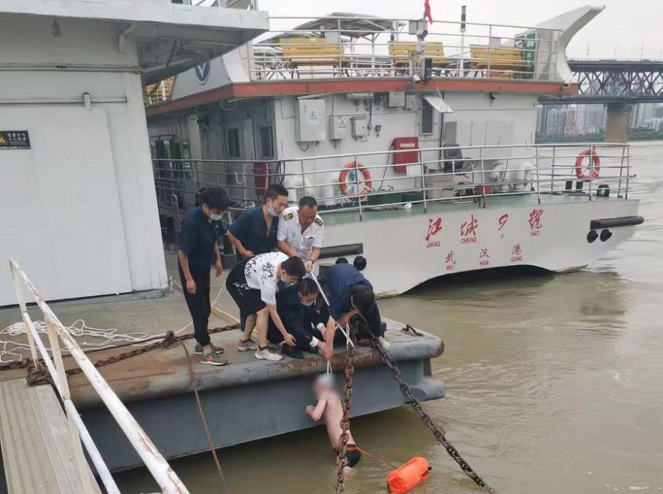 “快把绳子套在身上!”轮渡公司其他船员在刘添春的呼喊下也赶来帮忙,大家用防滑绳系成一个圈,从腋下套住游泳者,船上6人合力将其往上拉,最终使他成功脱险。长江日报记者从现场监控视频看到,船员们行动迅速、齐心协力,从发现遇险人员到成功救起来用时5分钟。不久后,接到报警电话的警察赶来,游泳者精神逐步好转,在民警的护送下离开了码头。