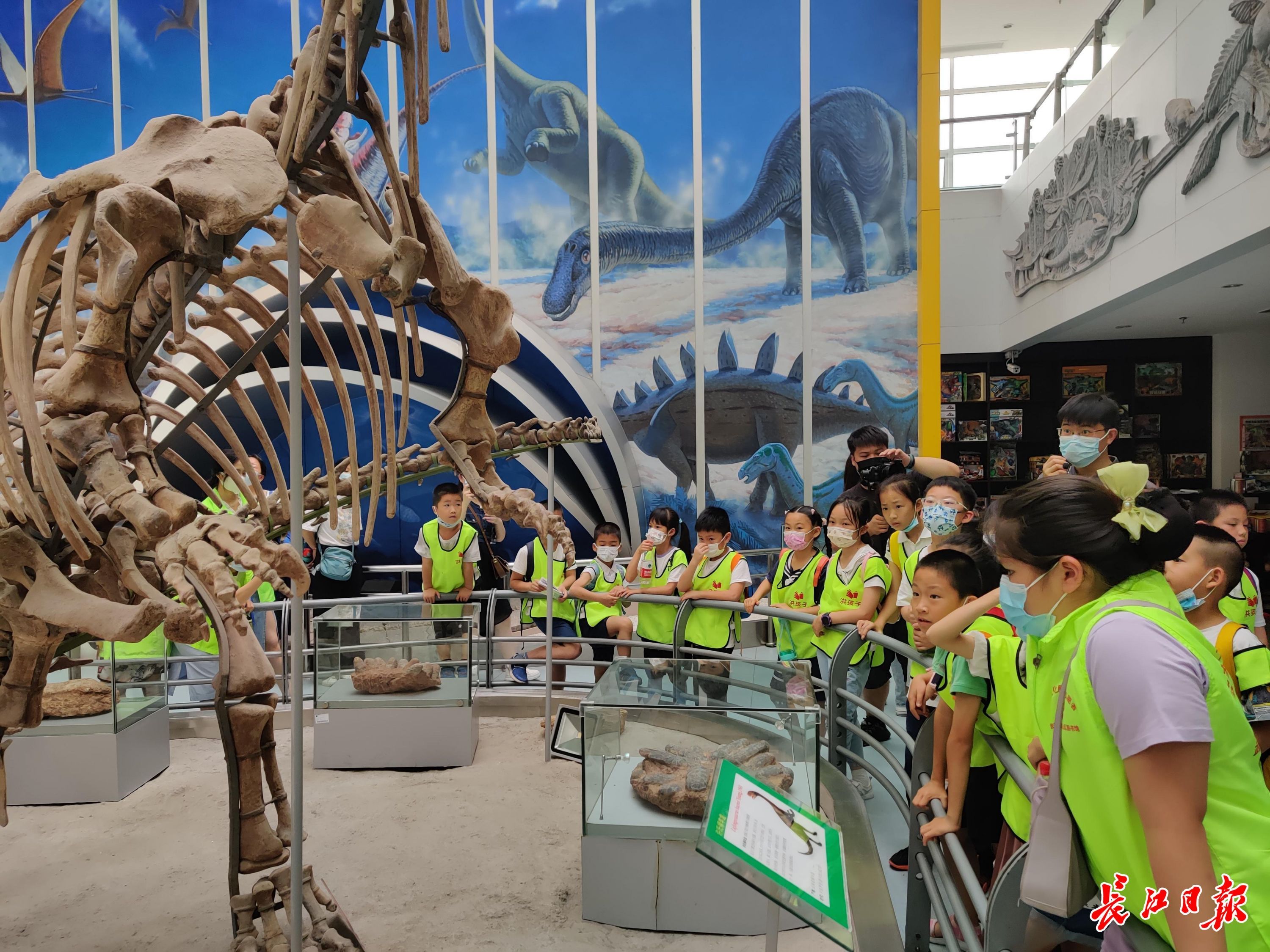 “洪孩子”们参观恐龙化石。记者李昕宇 摄